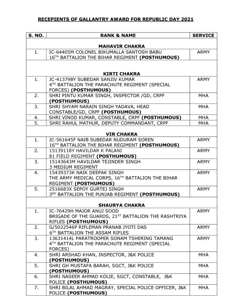 New Delhi: Colonel Bikumalla Santosh Babu of the 16th Battalion of Bihar Regiment, who led from the front and gave the supreme sacrifice fighting the Chinese PLA when they had violated the Line of Actual Control and launched a violent attack on Indian troops near Pangong Lake in Galwan valley in May 2020, will be conferred the second highest gallantry award of the country- the Mahavir Chakra (posthumous) on Republic Day.