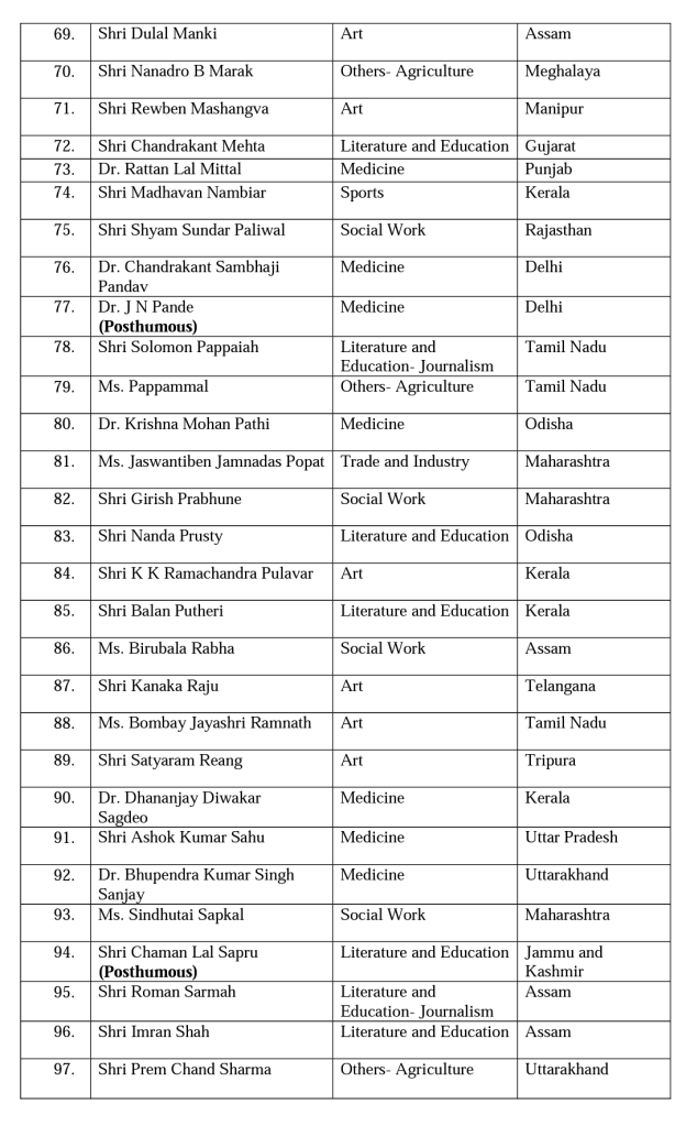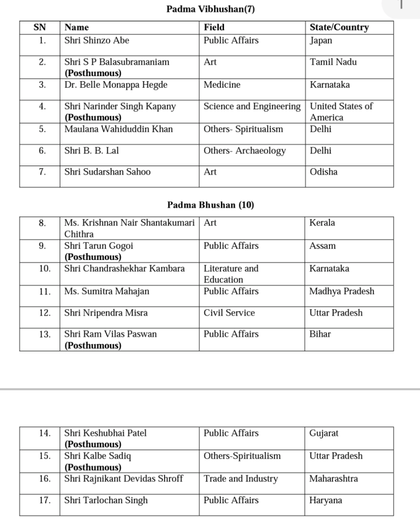The list of those being honoured with the Padma Awards comprises 7 Padma Vibhushan, 10 Padma Bhushan and 102 Padma Shri Awards. 29 of the awardees are women and the list also includes 10 persons from the category of Foreigners/NRI/PIO/OCI, 16 Posthumous awardees and 1 transgender awardee.