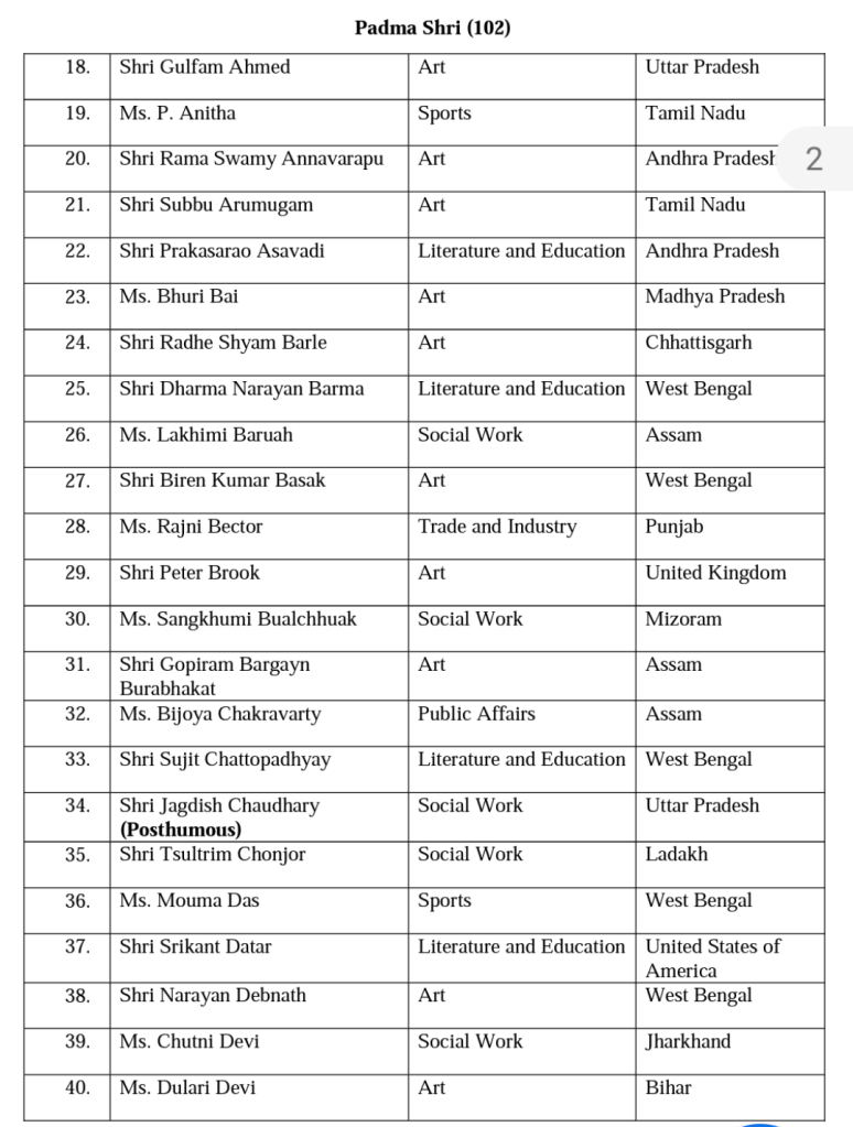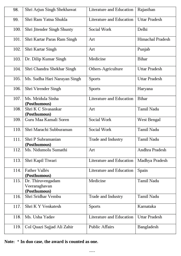 This year the President has approved conferment of 119 Padma Awards including 1 duo case (in a duo case, the Award is counted as one).