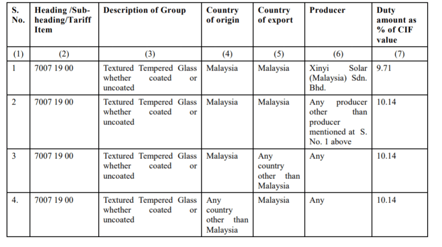 The Union Finance Ministry, in exercise of the powers conferred by sub-sections (1) and (6) of section 9 of the Customs Tariff Act, read with rules 20 and 22 of the Customs Tariff (Identification, Assessment and Collection of Countervailing Duty on Subsidized Articles and for Determination of Injury) Rules, 1995, after considering the final findings of the Designated Authority, in the matter of Textured Tempered Glass imported from Malaysia (or any other country) has issued the gazette notification to impose countervailing and anti-dumping duty.