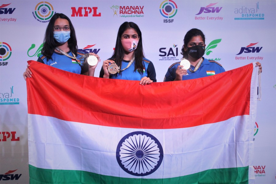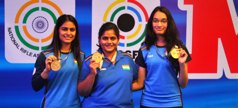 New Delhi: Sports Pistol trio Rahi Sarnobat, Manu Bhaker and Chinki Yadav, struck gold in the Women’s 25M Pistol Team event, in the ISSF Rifle/Pistol/Shotgun World Cup stage, New Delhi’s Dr. Karni Singh Shooting range here on Thursday. This was India’s 10th gold of this world cup and they continue to lead the table with 21 medals, including six silver and five bronze medals.