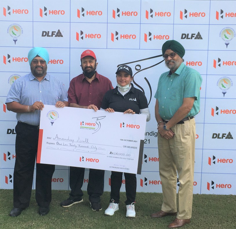 Chandigarh: Amandeep Drall fired eight birdies against just one bogey for a superb 7-under 65 to claim the 10th leg of the Hero Women’s Pro Golf Tour by three shots at the Chandigarh Golf Club.