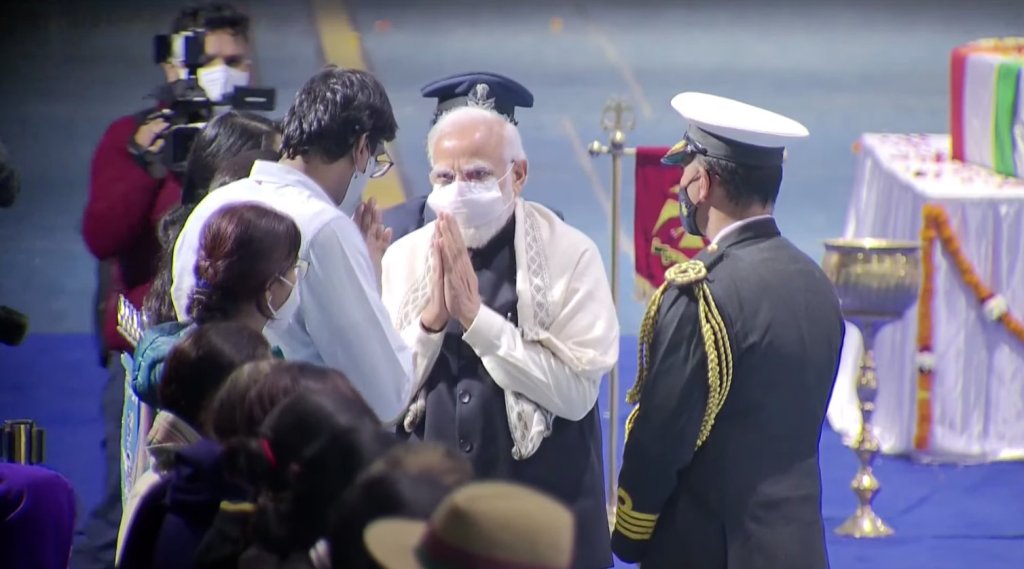New Delhi: Prime Minister Narendra Modi, Defence Minister Rajnath Singh, MoS Defence Ajay Bhatt & NSA Ajit Doval offered tributes to the mortal remains of CDS Gen Bipin Rawat, his wife and 11 other personnel at the Palam Technical Area Thursday evening.