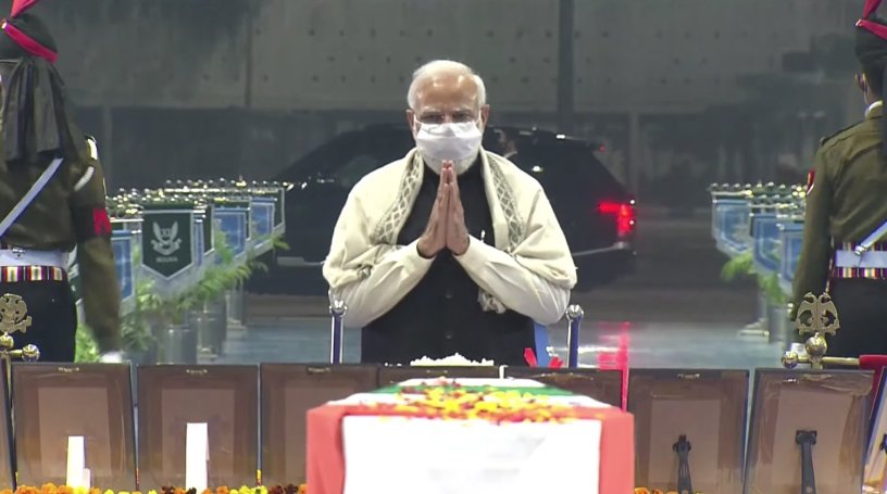 New Delhi: Prime Minister Narendra Modi, Defence Minister Rajnath Singh, MoS Defence Ajay Bhatt & NSA Ajit Doval offered tributes to the mortal remains of CDS Gen Bipin Rawat, his wife and 11 other personnel at the Palam Technical Area Thursday evening.