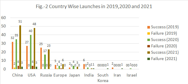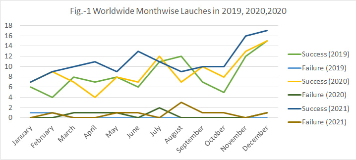 Fig.-1 shows month wise global launches in 2019, 2020 and 2021. The global space Industry not only appeared to be unaffected by the devastating pandemic, but in fact showed upward trend. No trend is visible over annual patterns over three years. In fact data from all three years show the typical upward trend as the year end is reached, showing the typical tendency of space agencies to shift to top gears to meet the annual target and this is in sharp contrast to what India has to flaunt in terms of India’s performance in the same sector.