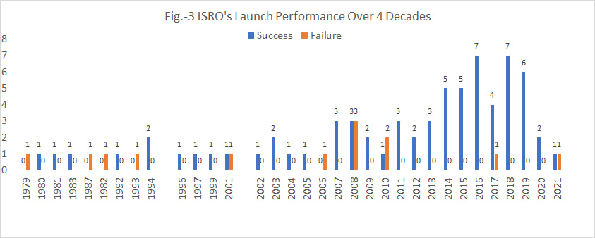 In Fig.-3, ISRO’s launch performance over last 4 decades can be observed.