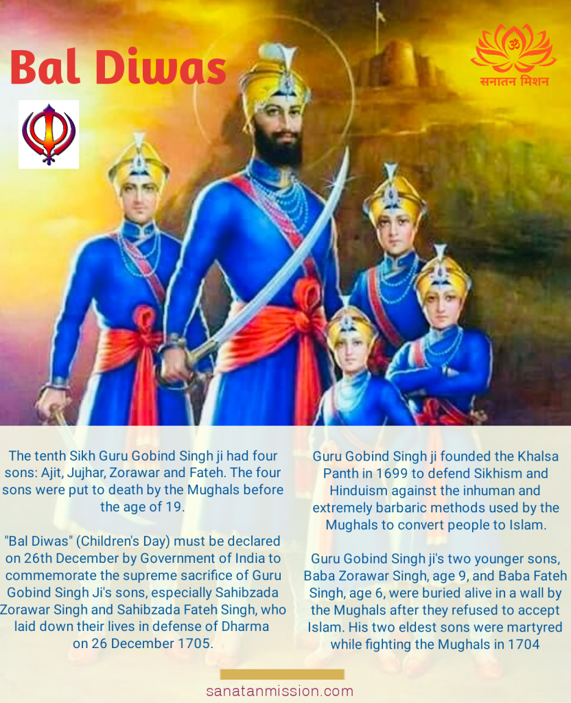 As the People of India celebrate “Azadi Ka Amrit Mahotsav”, Government of India has decided to commemorate 26th December as “Veer Baal Diwas” (वीर बाल दिवस) in the honor of supreme sacrifice made by Sahibzada Zorawar Singh and Sahibzada Fateh Singh; younger sons of tenth Sikh Guru Govind Singh JiTherefore, the Government of India has declared 26th December as “Veer Baal Diwas” (वीर बाल दिवस). This decision has been taken as a tribute of the grateful Nation to the great valour and supreme sacrifice of Sahibzada Zorawar Singh and Sahibzada Fateh Singh in their quest for justice.