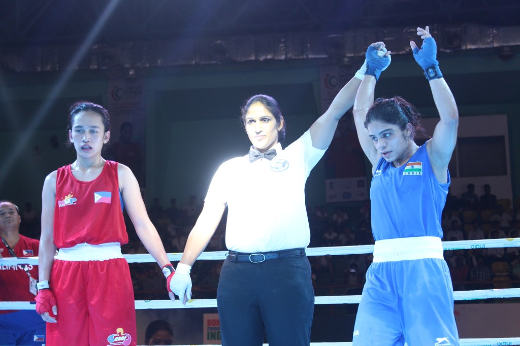 Nitu opened the day’s proceedings brilliantly as she recorded a dominating 5-0 win against Russian Iuliia Chumgalakova in the first round of 48kg