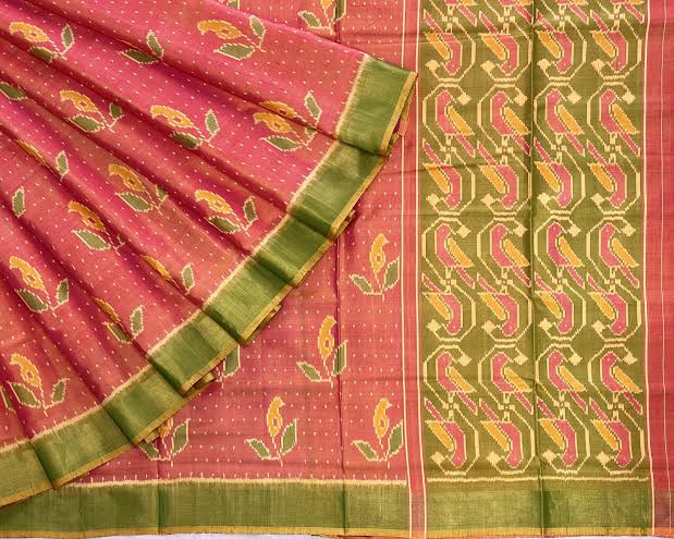 Another famous saree of Gujarat is the Patola saree, which are very expensive and depict painted peacocks from Patan. Patola saris are elaborate as they have intricate five-colour designs which are resist-dyed into both warp and weft threads before weaving. Only about 25 to 30 sarees are made in a year, hence are extremely expensive.