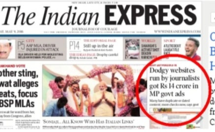 The Indian Express published a news item on 9 May 2016 on its front page with the title “MP list for 2012-15 shows dodgy websites run by journalists got Rs 14 crore in govt ads” by Shyamlal Yadav. This piece obviously points to a shoddy attempt by an award winning journalist to sensationalise a serious issue without backing it with solid investigation that would have helped him to zoom in and present a comprehensive list of all those websites that were really “dodgy.