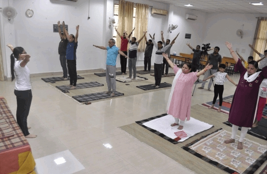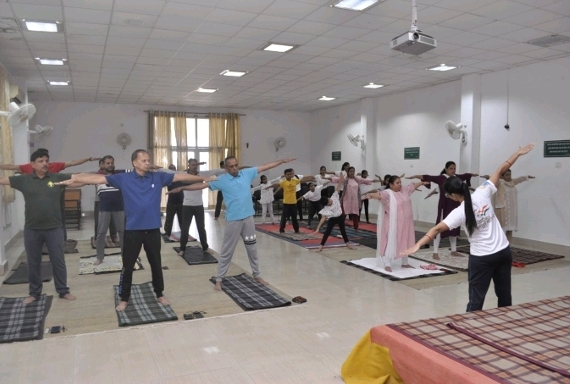 On this occasion, faculty members, officers, employees, and their children took part in yoga-asanas and advocated the message of staying healthy. While practicing various asanas under the guidance of the yoga teacher Jaya Nema, everyone reiterated the importance of yoga for a healthy body and mind.