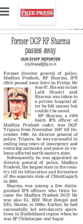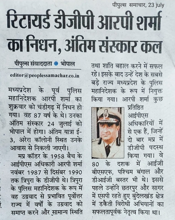 The former DGP passed away on Friday 22 July. He was 87. His mortal remains were kept at his Arera Colony residence for family members, friends, and those from the Police to pay their last respects.