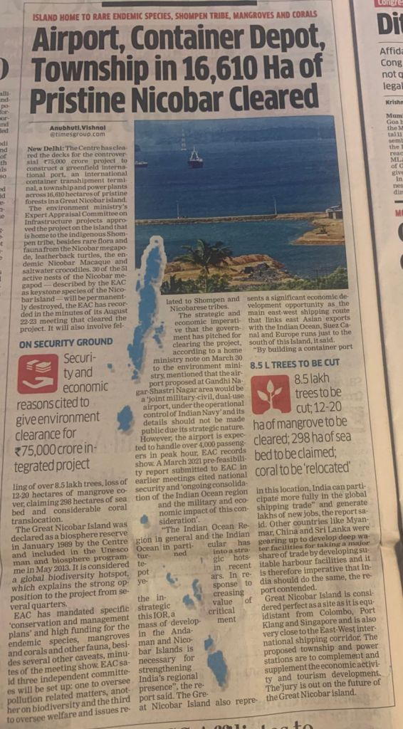 The Economic Times has published a news item about the “forest diversion” and “environment clearance” accorded to the Airport, Container Depot, Township in 16,610 hec of Pristine Nicobar.