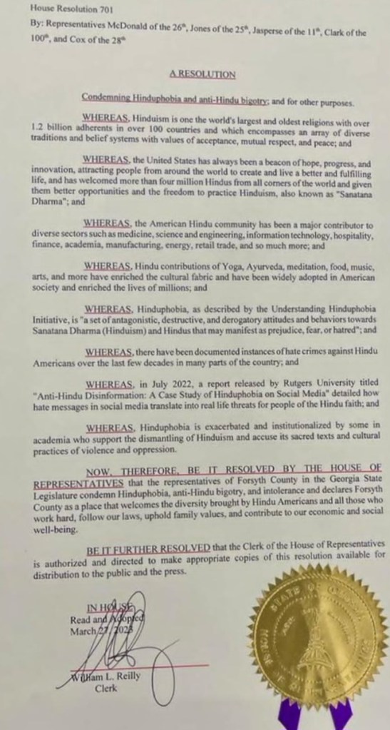 Atlanta: The representatives of Forsyth County in the Georgia State Legislature have passed a resolution condemning Hinduphobia, anti-Hindu bigotry, and intolerance and declared Forsyth County as a place that welcomes the diversity brought by Hindu Americans and all those who work hard, follow the laws, uphold family values, and contribute to the economic and social well being.