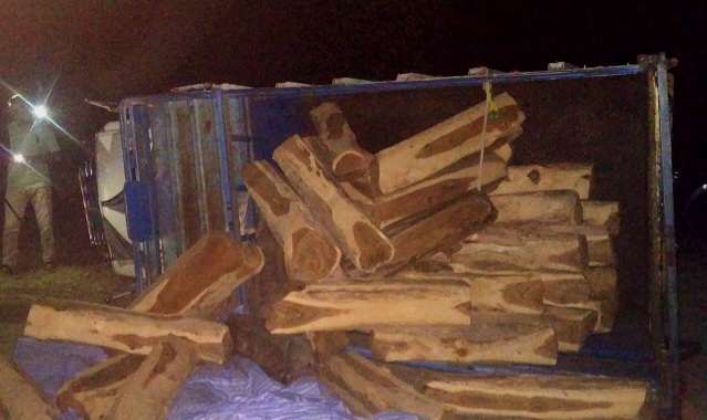 Bhopal: A forest department team during patrolling late night on Sunday 23 April intercepted a teak wood laden pickup up vechicle on the border of Nazeerabad and Narsingharh near the State capital. After a short chase, the forest staff managed to seize the illegally felled and sawn timber and also the vehicle being used to smuggle the teak when it lost balance and overturned. The driver of this vehicle managed to escape in the cover of darkness.