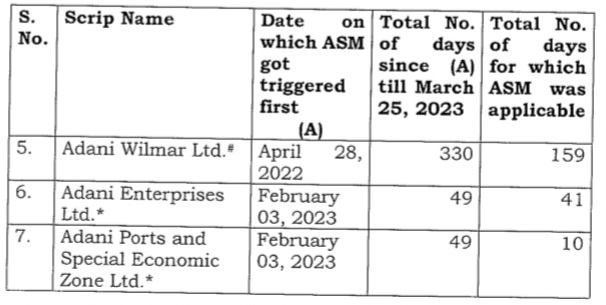 SEBI also submitted that the Adani Group scrips have been were subjected to various surveillance measures ander the ASM framework. Trading in each of the seven stocks (below) has been scrutinised and kept under watch.
