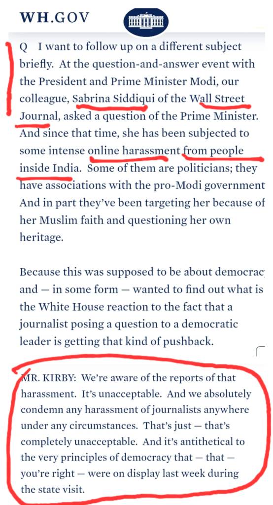 If a journalist, whose vision and world view is either stunted or is completely biased, has the right to ask anything to serve a fixed agenda; if the White House has the right to dub as “unacceptable” posts on social media that counter such a journalist, the citizens of India also have the right to blast the journalist who obviously chose to use the anti-India toolkit during Prime Minister Narendra Modi and US President Joe Biden’s joint Press Conference at White House.