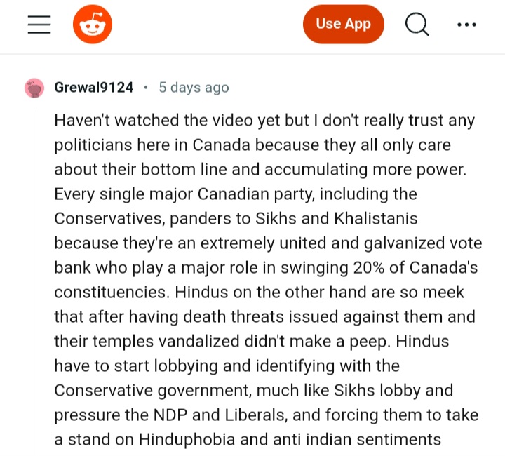“I don’t really trust any politicians here in Canada because they all only care about their bottom line and accumulating more power. Every single major Canadian party, including the Conservatives, panders to Sikhs and Khalistanis because they’re an extremely united and galvanized vote bank who play a major role in swinging 20% of Canada’s constituencies. Hindus on the other hand are so meek that after having death threats issued against them and their temples vandalized didn’t make a peep. Hindus have to start lobbying and identifying with the Conservative government, much like Sikhs lobby and pressure the NDP and Liberals, and forcing them to take a stand on Hinduphobia and anti indian sentiments.” – A comment on Reddit