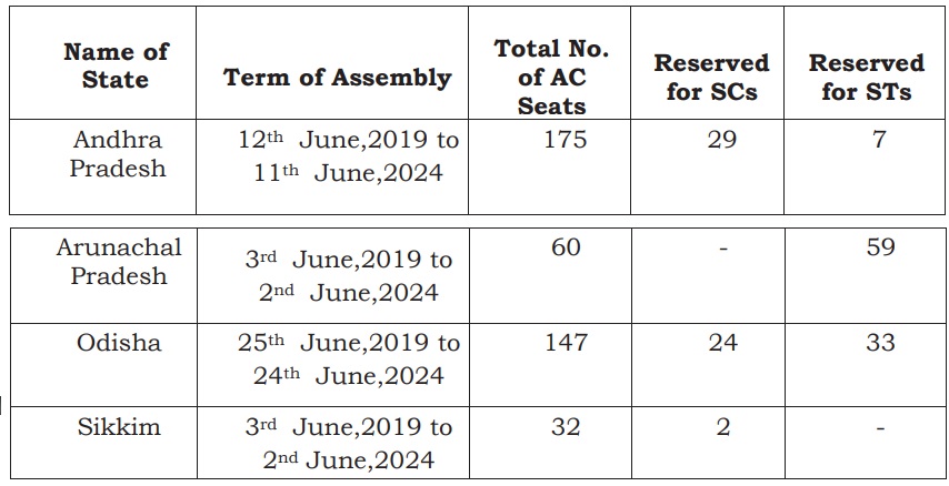 The term and strength along with seats reserved for Scheduled Castes and Scheduled Tribes of the Assembly Constituencies of Andhra Pradesh, Arunachal Pradesh, Odisha and Sikkim are as under: