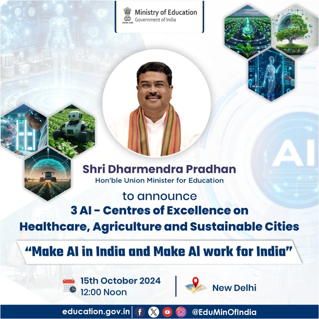 New Delhi: Union Minister for Education Dharmendra Pradhan will be making a significant announcement about three AI Centres of Excellence (CoE) focused on Healthcare, Agriculture, and Sustainable Cities in the Union capital on Tuesday 15 October.