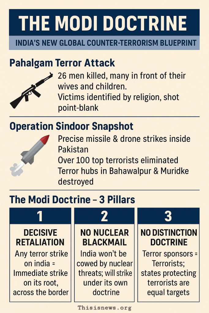 New Delhi: In a landmark national address that has resonated across the global strategic landscape, Prime Minister Narendra Modi declared the successful execution of Operation Sindoor as a turning point in India’s counter-terrorism policy and global security framework. Positioning himself as a resolute and visionary leader in the global war on terror, Prime Minister Modi has unveiled a bold, unapologetic security architecture that could best be termed the “Modi Doctrine” — a doctrine built on decisive retaliation, strategic autonomy, and zero tolerance for terrorism.