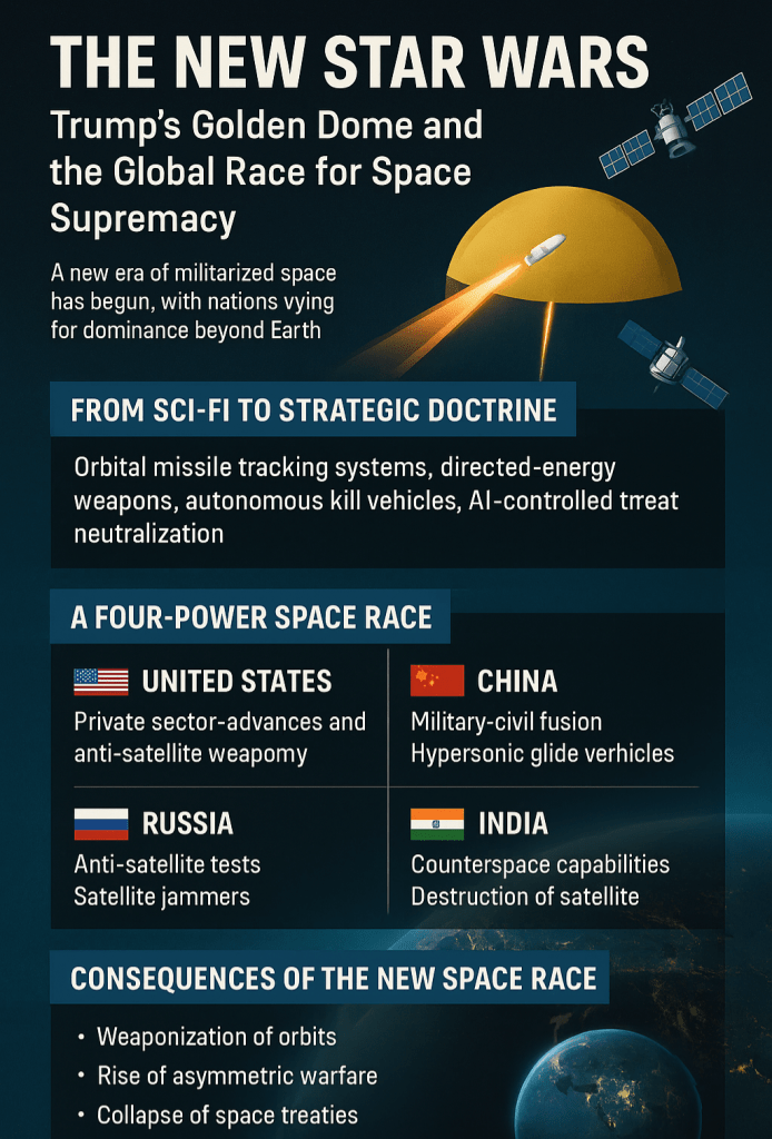 U.S. President Donald Trump’s announcement on 20 May of a $175 billion “Golden Dome” missile defense initiative is far more than a domestic defense policy move. It is the ignition key to a new phase of the global space race—a 21st-century Star Wars where dominance is measured not in nuclear stockpiles alone, but in satellite constellations, hypersonic interceptors, orbital kill vehicles, and space-based lasers. The Golden Dome is being projected as a shield, but it is in reality a signal flare—an open declaration that the United States seeks to own the high ground of warfare: space.