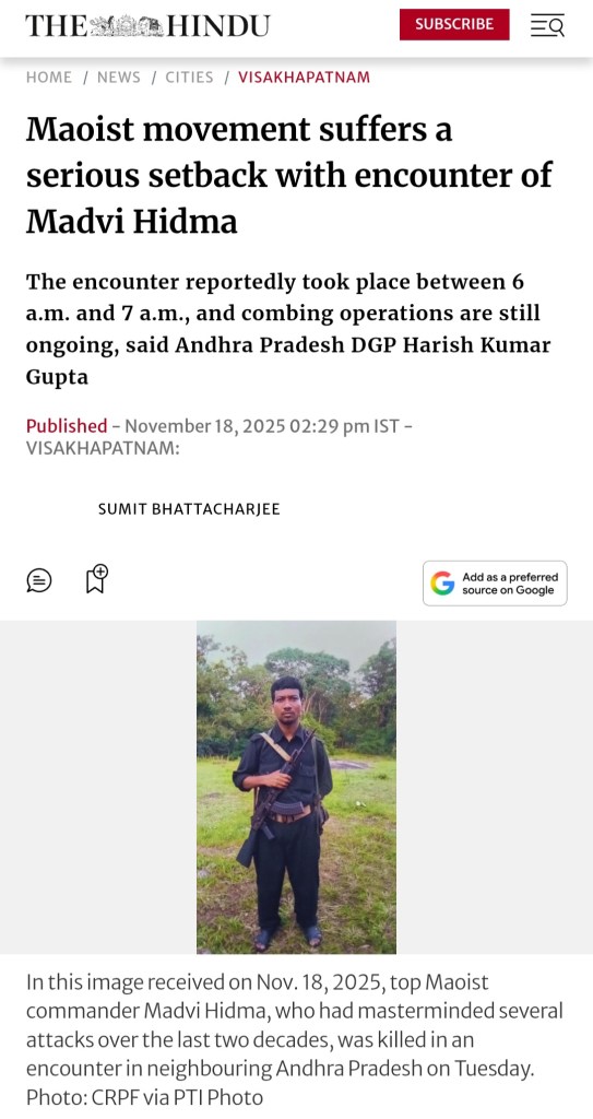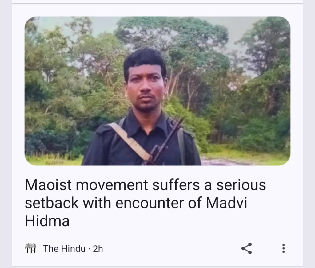 A headline on 18 November 2025 announcing that the “Maoist movement suffers a serious setback with encounter of Madvi Hidma” may appear routine to some. But the wording reveals a dangerous flaw in how sections of the media continue to frame this long, brutal chapter of insurgency.