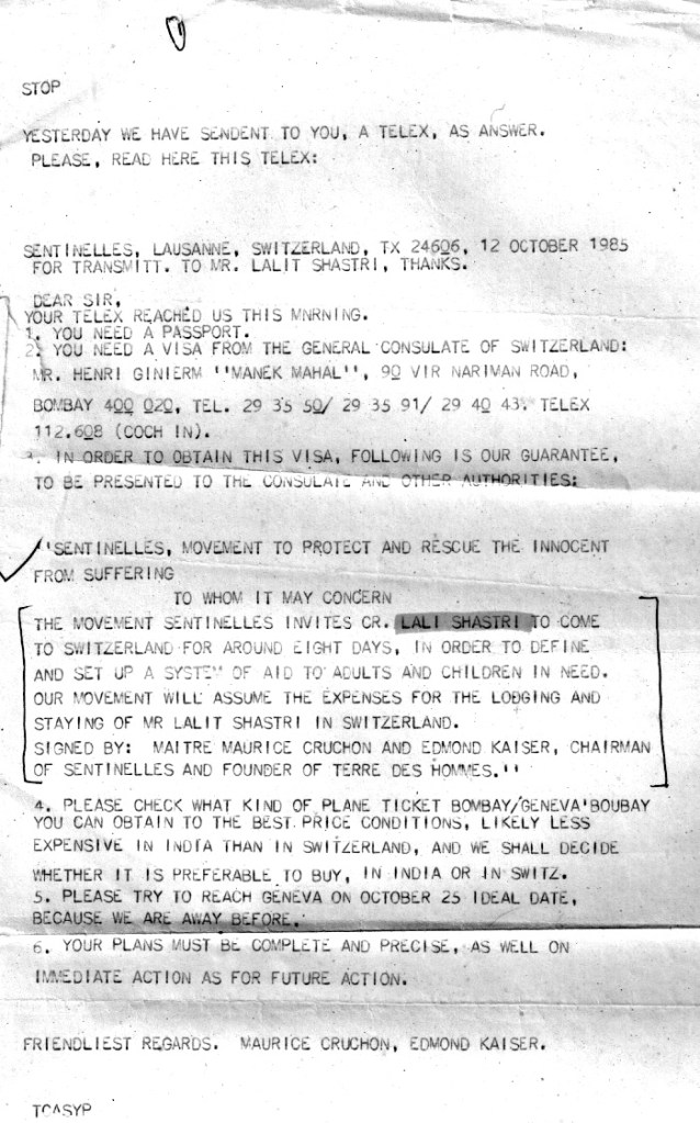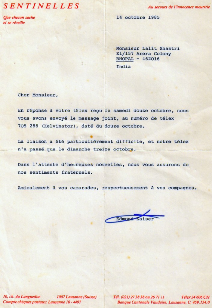 When Lalit was conducting investigation and ground level survey for his book on Bhopal gas disaster, two leading members of a Swiss charity organisation (Sentinelles) – it’s founder Edmond Kaiser (also the founder of Terre des hommes ) and Maurice Cruchon, met him in Bhopal in the first fortnight of October 1985.